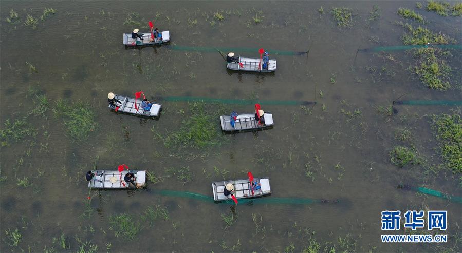 5月18日,养殖户在江苏省盱眙县淮河镇明祖陵村虾稻共生示范园区开捕小龙虾(无人机拍摄)。当日,第十九届中国·盱眙国际龙虾节龙虾开捕仪式在江苏省淮安市盱眙县举行。记者 李雨泽 摄