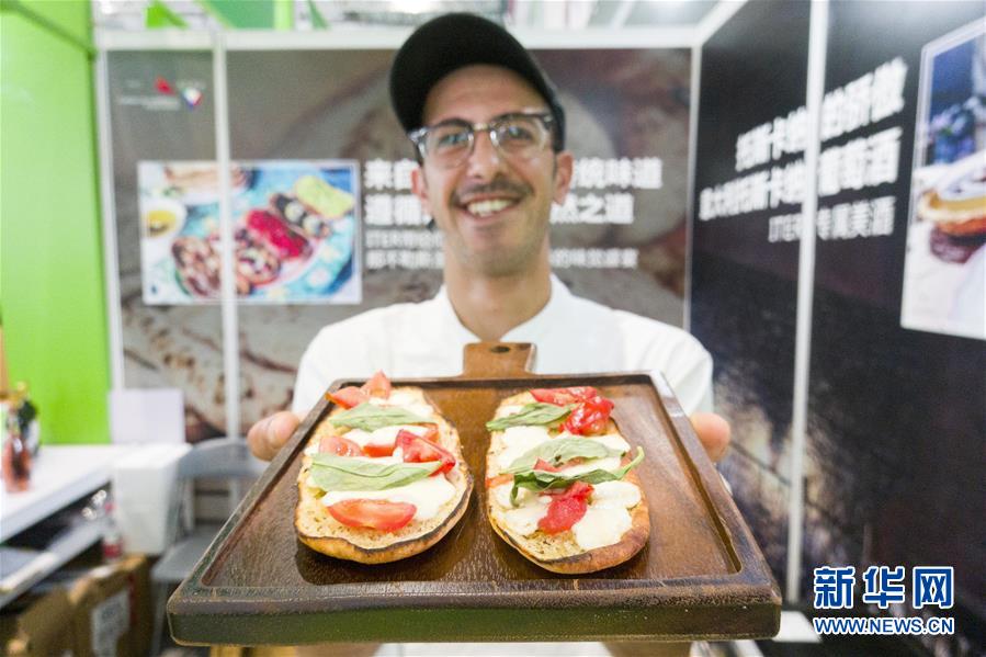 11月7日,在第二届进博会食品及农产品展区,意大利厨师展示“滑板”。这是一种意大利特色面食,底下是香脆面饼,上面放上番茄、奶酪、罗勒叶等新鲜食材烤制而成。 第二届中国国际进口博览会正在上海国家会展中心举行,食品及农产品展区来自全球的优质农产品和各种特色美食吸引观众驻足品尝。 新华社记者 才扬 摄