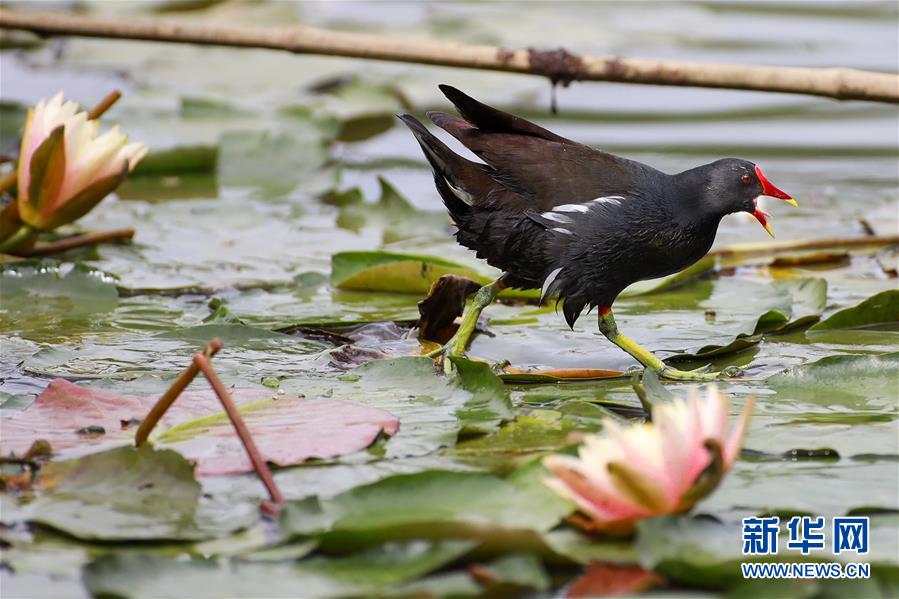 5月22日,一只红嘴水鸡在莲叶间行走。 近日,贵阳市观山湖公园内大片盛开的莲花吸引了不少水鸟在其间嬉戏觅食。 新华社记者 刘续 摄