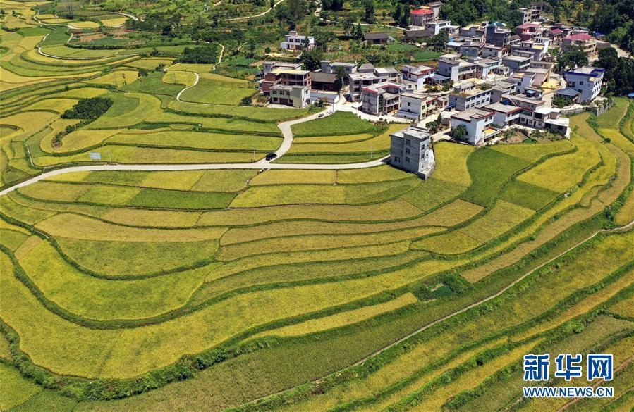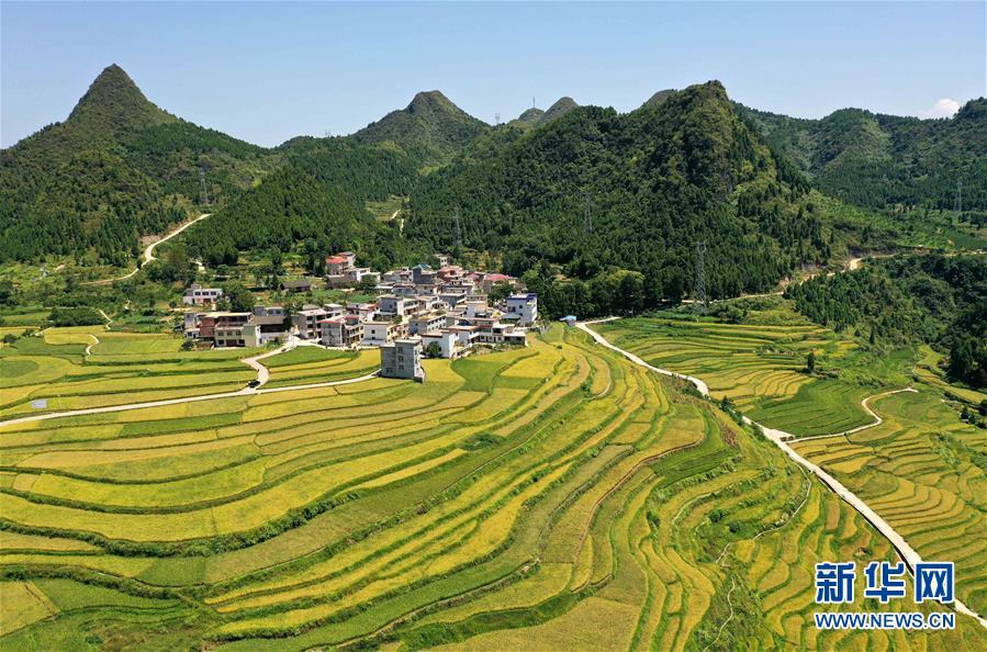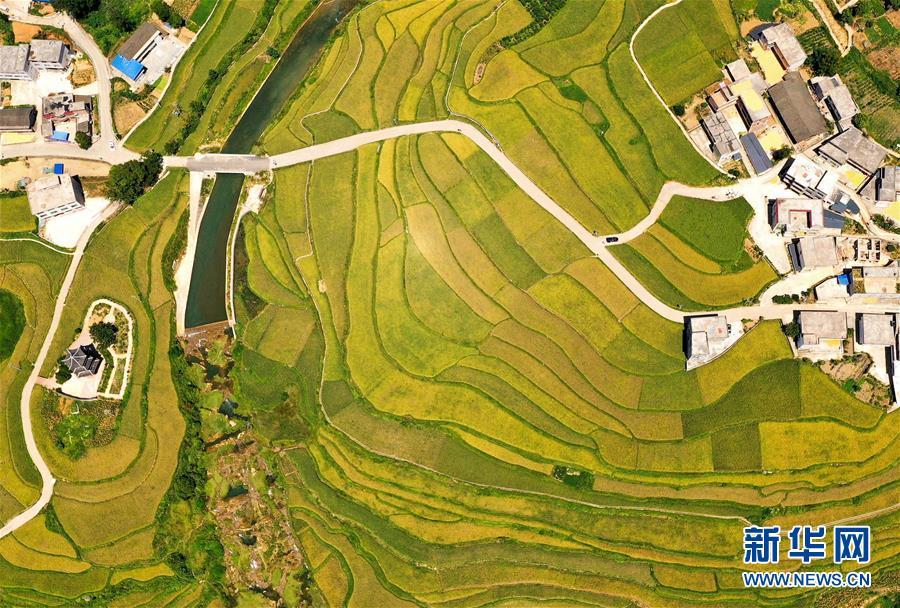 这是8月28日拍摄的贵州省铜仁市玉屏侗族自治县亚鱼乡郭家湾村梯田景色(无人机照片)。 (欧秀灯 摄)