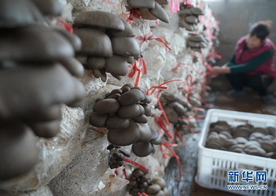 11月17日,河北省顺平县白云乡常大村的一位农民在大棚内采摘蘑菇。