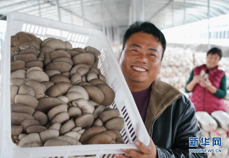 11月17日,河北省顺平县白云乡常大村的一位农民在大棚内展示刚采摘的蘑菇。