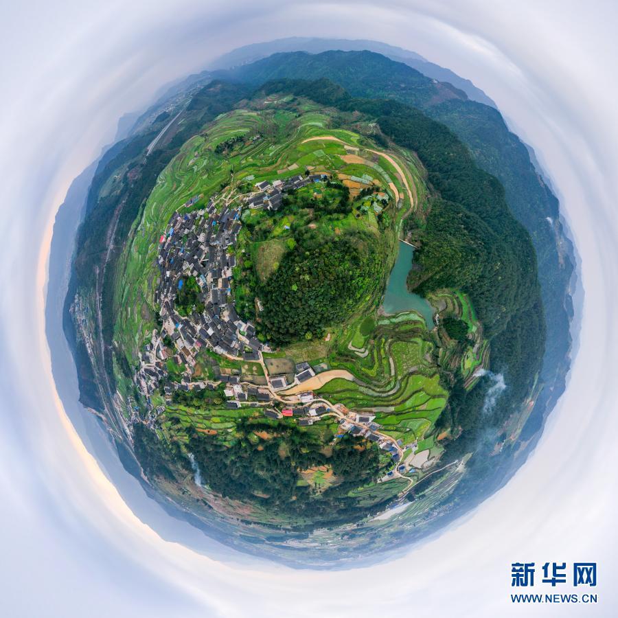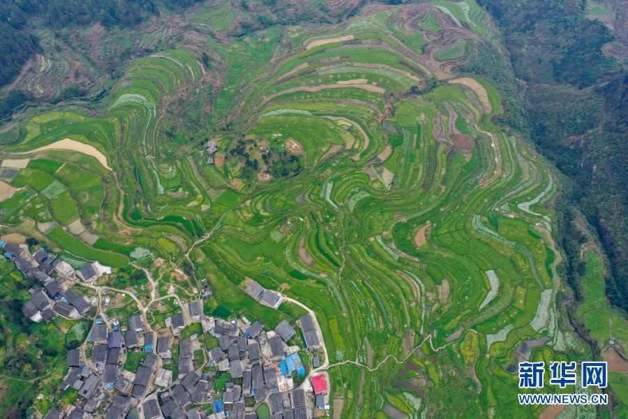 丹寨县龙泉镇民居和高要梯田(3月19日摄,无人机全景照片)。