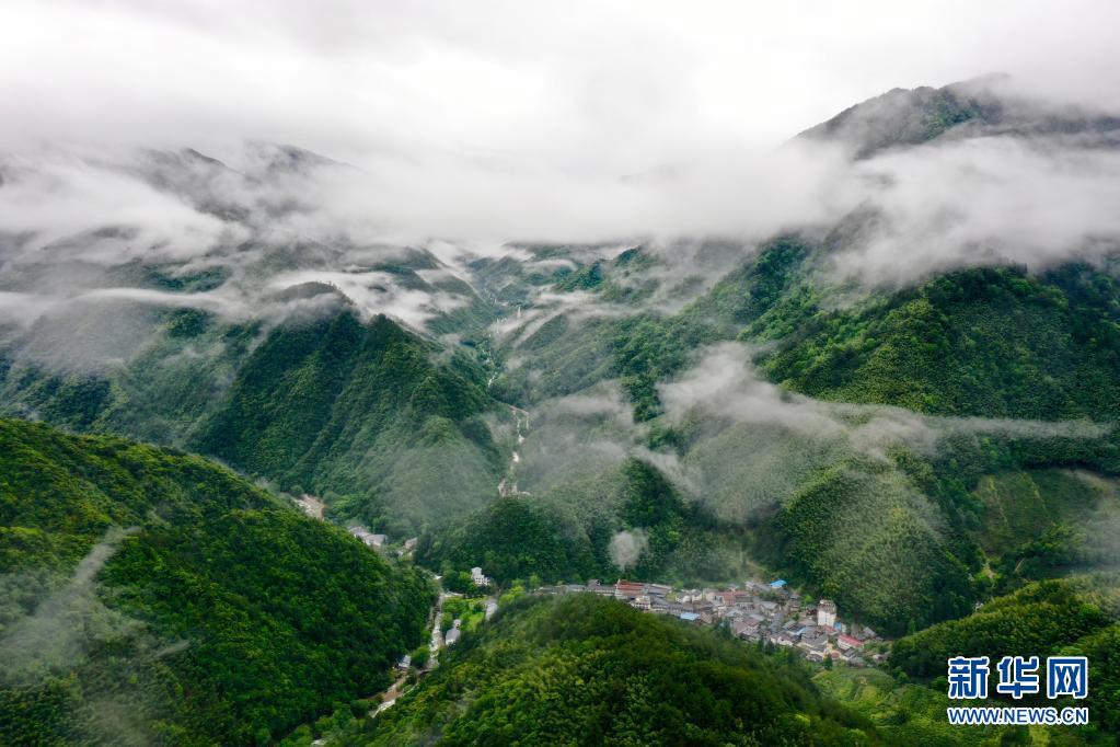 这是5月18日拍摄的武夷山国家公园腹地的原始森林与村落(无人机照片)。