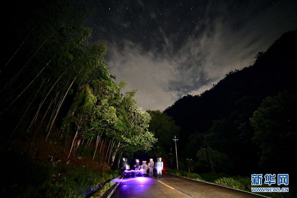 5月16日,两栖爬行类专项科考队员夜晚在武夷山国家公园桐木村附近进行生物资源本底调查。