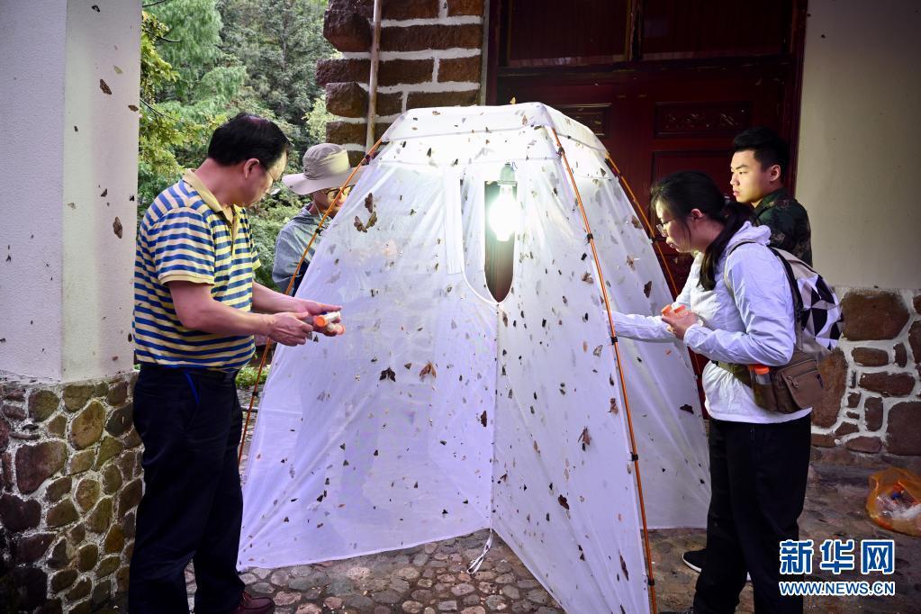 5月17日晚,昆虫专项科考队员在武夷山国家公园生物资源本底调查时收集灯光诱捕的飞蛾标本。