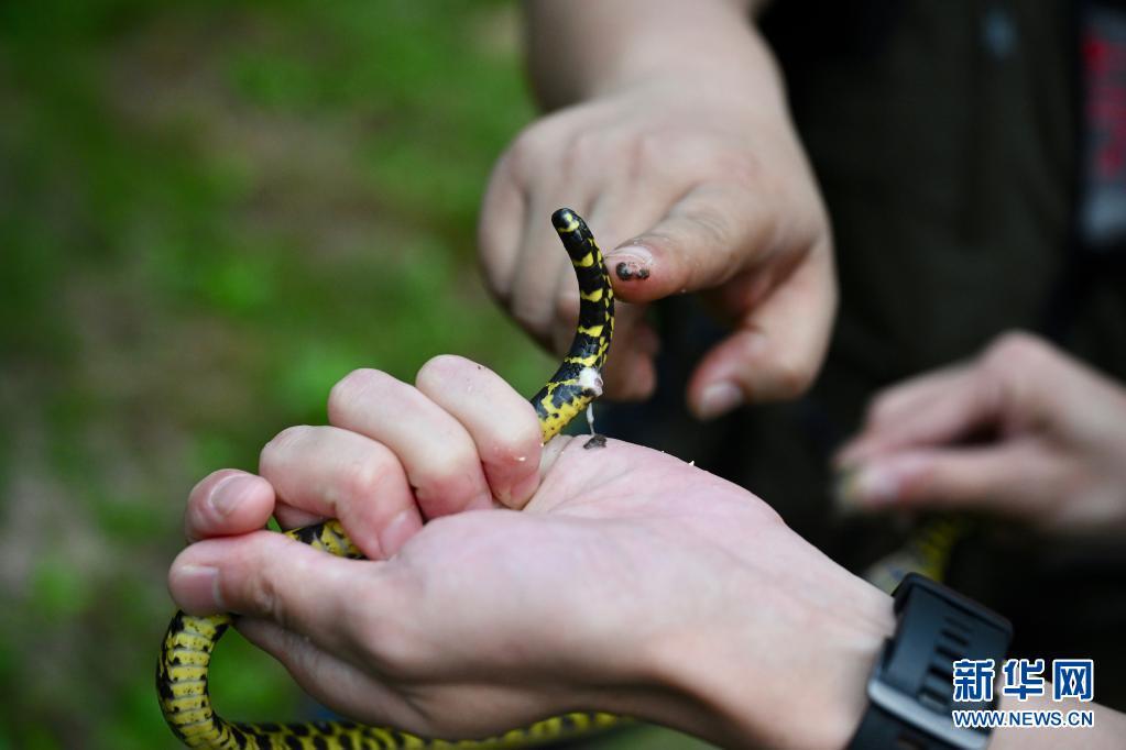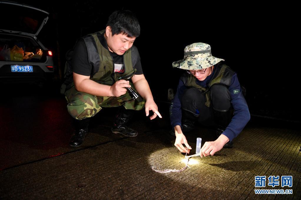 5月16日,两栖爬行类专项科考队员夜晚在武夷山国家公园桐木村附近调查时采集蛇类样本。