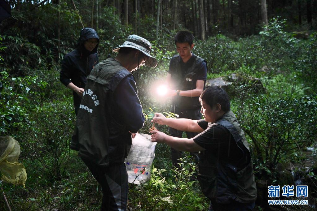 5月16日,两栖爬行类专项科考队员傍晚冒雨在武夷山国家公园桐木村挂墩自然村附近山林中采集生物样本。