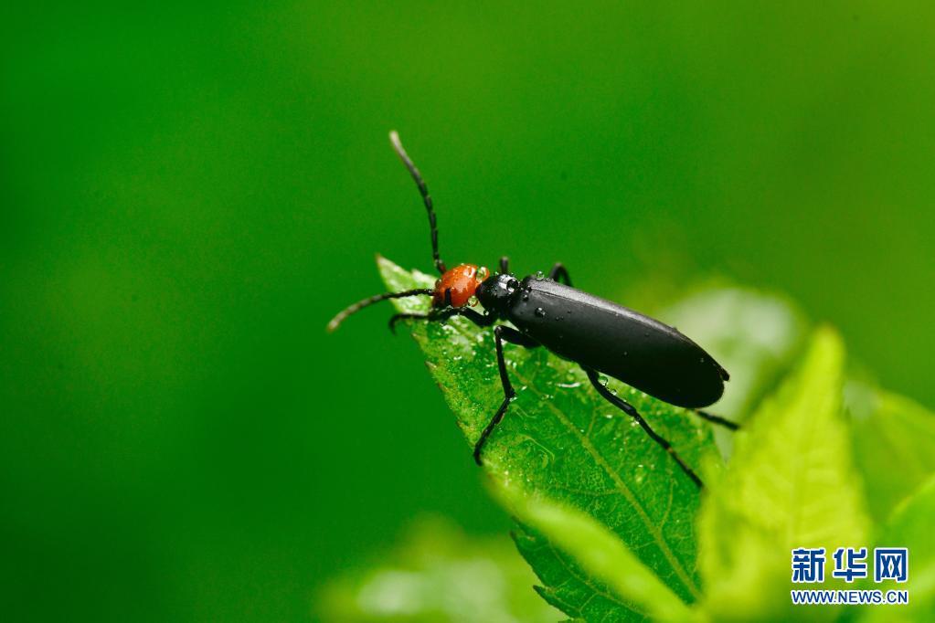 5月17日,武夷山国家公园内一只芫青虫停留在叶片上。