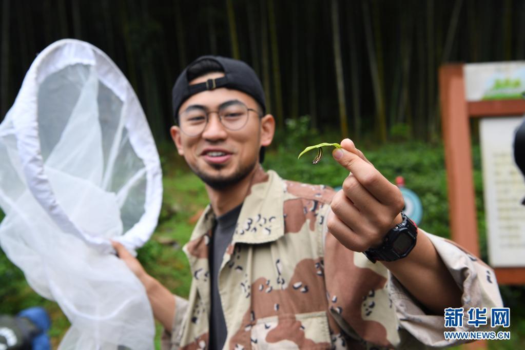5月17日,昆虫专项科考队员展示在武夷山国家公园大竹岚发现的苎麻珍蝶蛹。