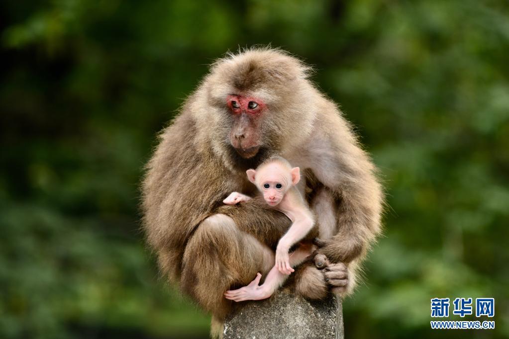 5月16日,武夷山国家公园一只野生藏酋猴抱着小宝宝在桥头停留。