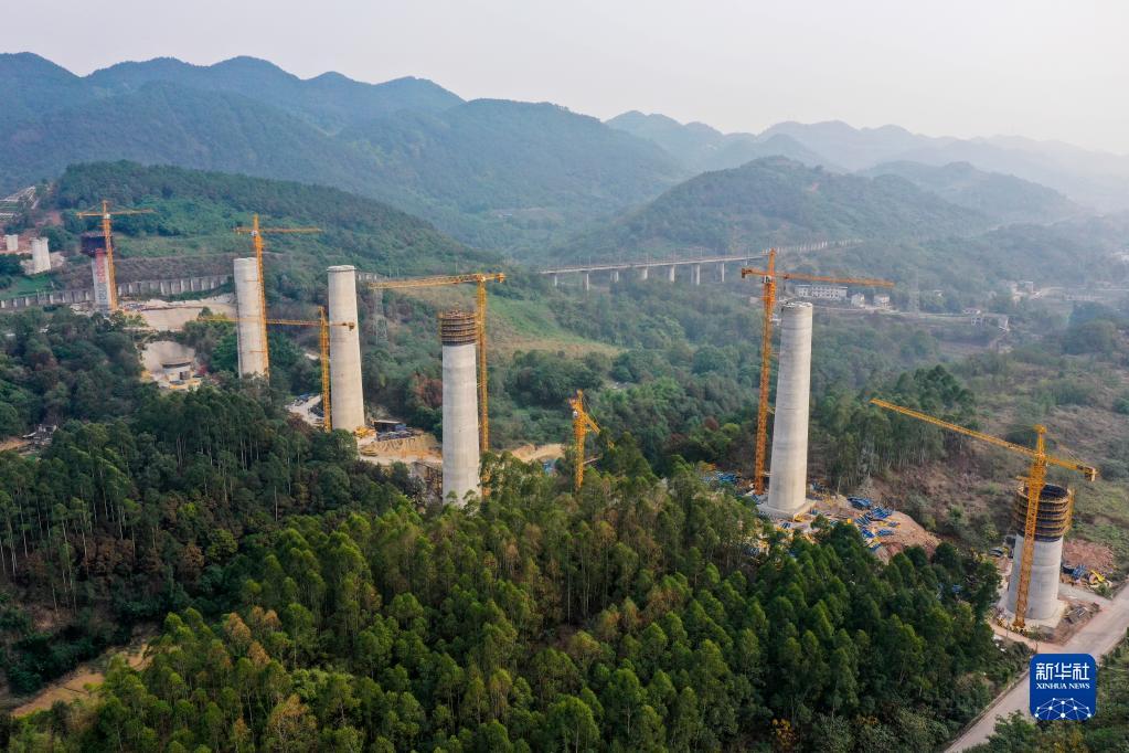 这是11月28日拍摄的建设中的渝昆高铁川渝段华福大桥(无人机照片)。