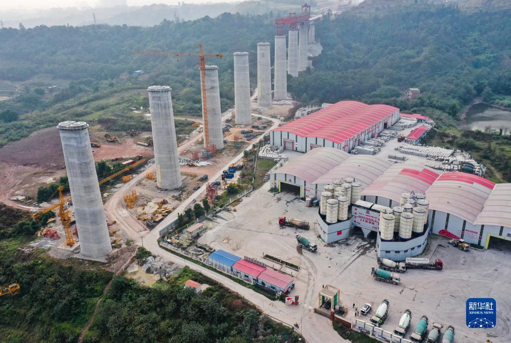 这是11月28日拍摄的渝昆高铁川渝段华福特大桥施工作业现场(无人机照片)。