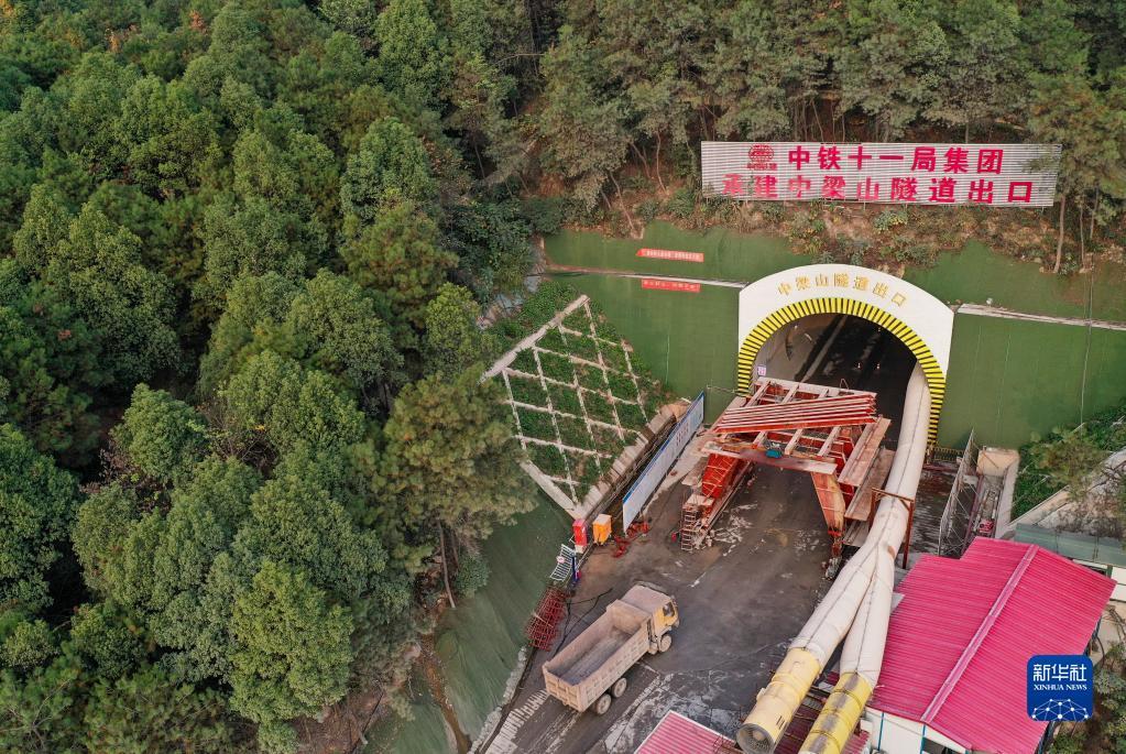这是11月28日拍摄的渝昆高铁川渝段中梁山隧道施工作业现场(无人机照片)。