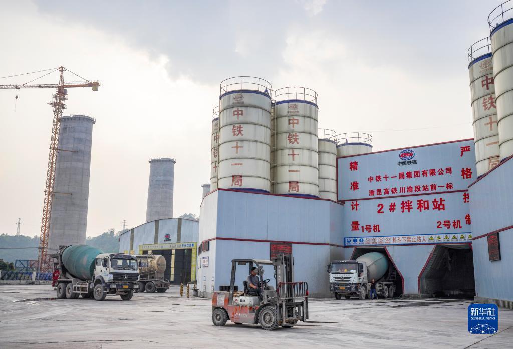 这是11月28日拍摄的渝昆高铁川渝段站前一标2号拌和站作业现场。