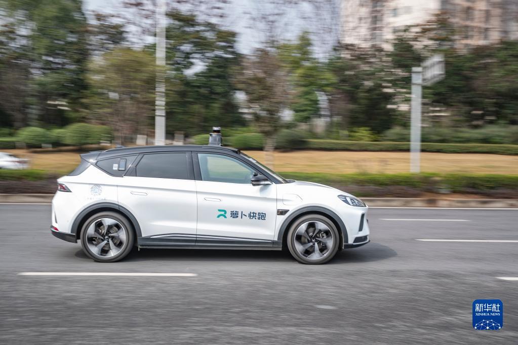 这是3月3日在重庆市永川区拍摄的行驶在城区道路上的百度Apollo自动驾驶出行服务车。