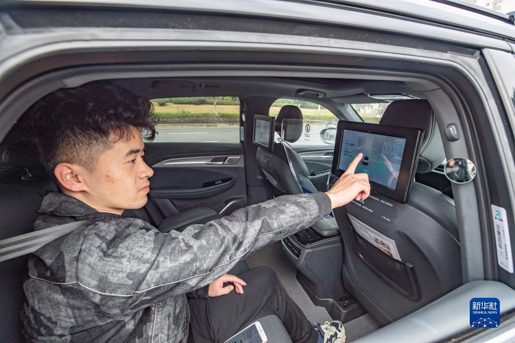 3月3日,在重庆市永川区,乘客搭乘百度Apollo自动驾驶出行服务车。