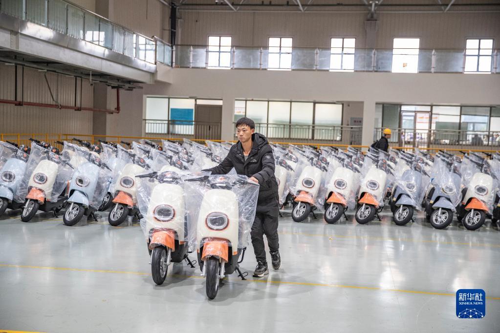 2月22日,在雅迪科技集团重庆永川电动车生产基地,员工将成品电动车推至智能化运输线上运往仓库。