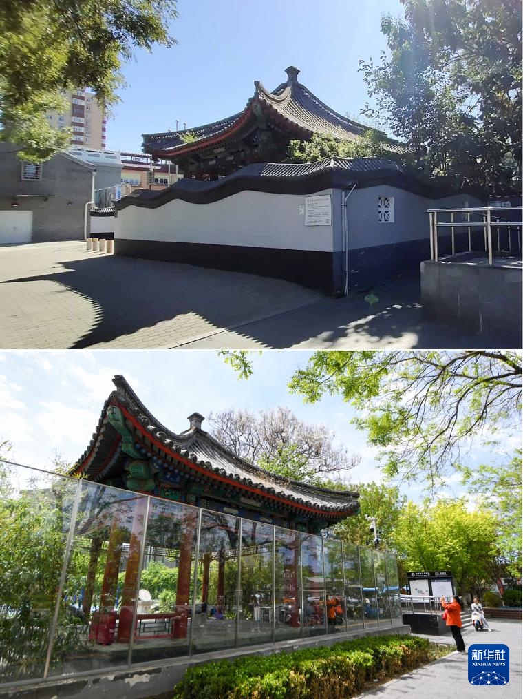 拼版照片:上图为北京市东城区东四九条小学围墙内的贝子奕谟府遗存——咏竹亭(资料照片);下图为2024年4月23日,一位行人参观咏竹亭,崇雍大街改造中将此处封闭围墙改造为透景围墙(记者鞠焕宗摄)。