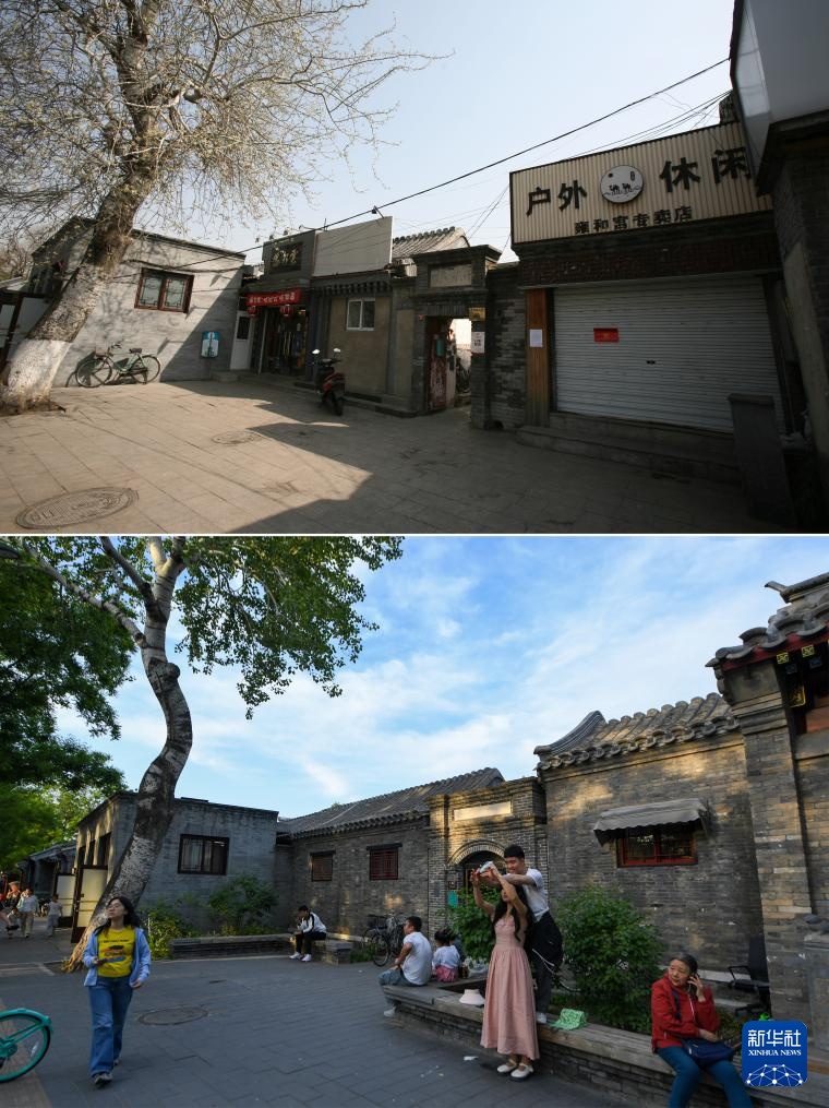 拼版照片:上图为2018年6月8日拍摄的雍和宫大街40号附近商铺和原有广告牌匾(资料照片);下图为2024年5月11日拍摄的改造后的雍和宫大街40号(记者鞠焕宗摄)。