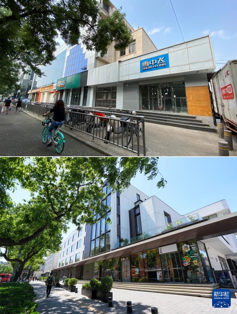 上图为位于东四南大街的原三友商场(资料照片);下图为2024年5月11日拍摄的由原三友商场改造而来的雪莲·亮点文创园外景。雪莲·亮点文创园已成为时尚生活打卡地和文化产业集合地(记者鞠焕宗摄)。