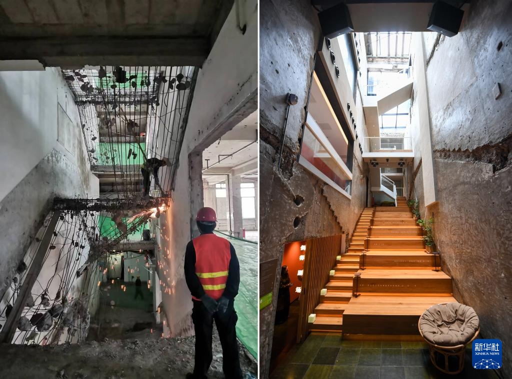 左图为改造中的位于东四南大街的原三友商场楼梯间(资料照片);右图为2024年4月23日拍摄的由原三友商场楼梯间改造而来的雪莲·亮点文创园偶得剧场(记者鞠焕宗摄)。