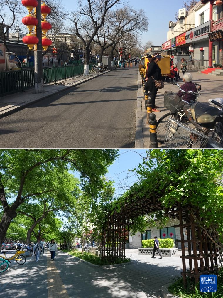 拼版照片:上图为2018年3月25日拍摄的东四北大街126号附近一处道路(资料照片);下图为2024年5月11日拍摄的相同地点,道路改造后步行空间被拓宽,并增加了街边绿地花园(记者鞠焕宗摄)。