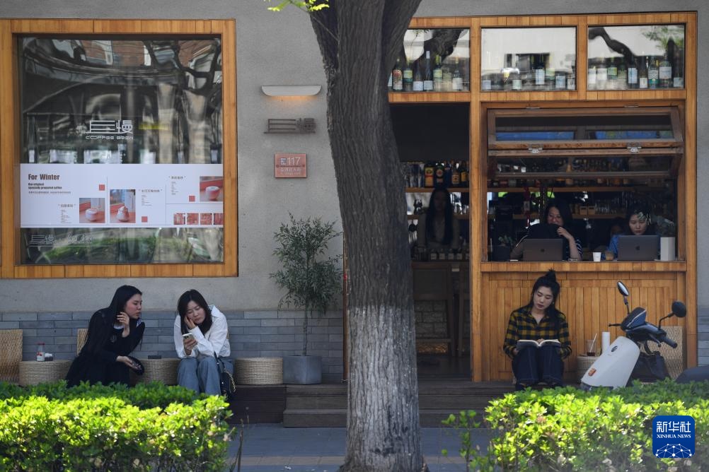 顾客在东四北大街117号一处咖啡店休闲(4月16日摄)。