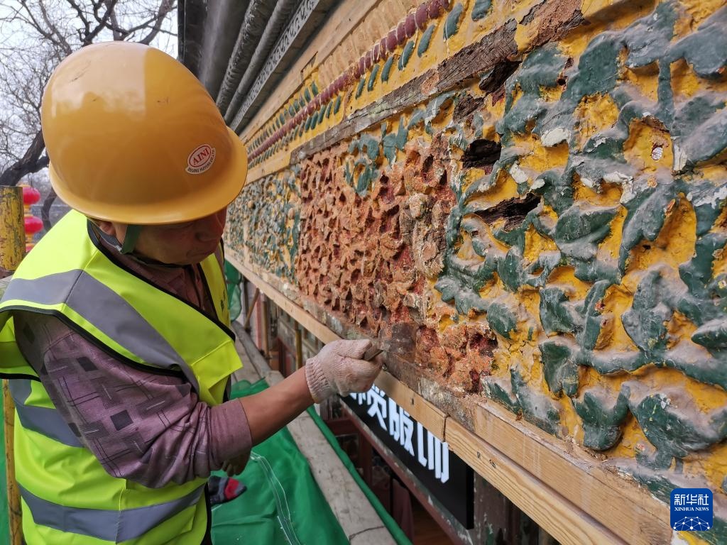 在东四南大街108号,在拆除了原有违规广告牌匾后,施工人员对建筑进行保护性修缮,恢复早期建筑风貌,此处原址是有着百余年历史的合芳楼饽饽铺(2021年3月11日摄)。