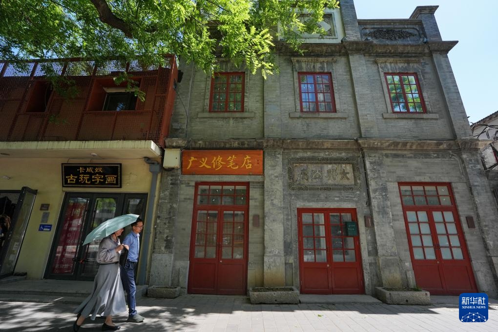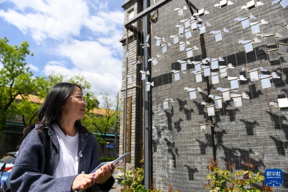行人经过改造修缮后的东四南大街102号大兴公寓旧址(5月11日摄)。