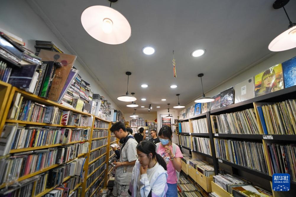 在东四北大街499号内的一处唱片店,顾客选购唱片(5月1日摄)。