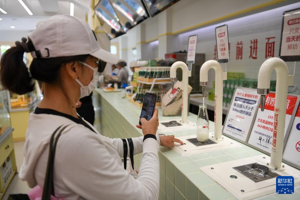 在东四北大街138号一家面包店内,顾客购买鲜牛奶(4月16日摄)。