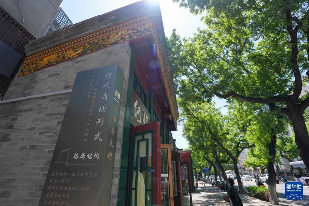 在东四南大街拍摄的介绍东四南大街传统商铺形式的装饰(5月11日摄)。