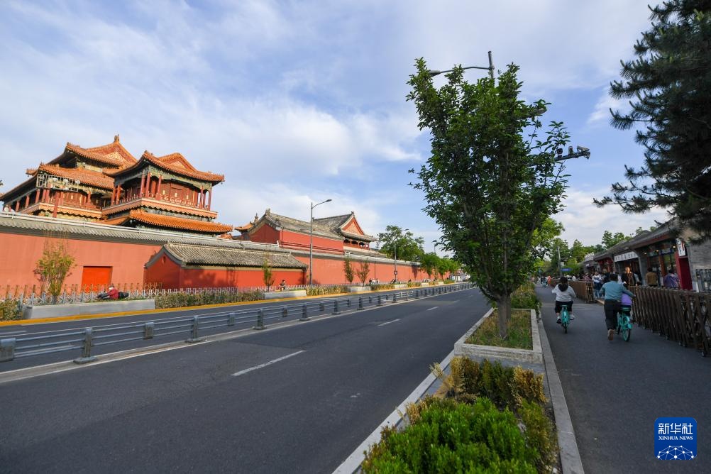 5月1日,市民游客在东四北大街骑行。崇雍大街改造推动“慢行优先”“健步悦骑”,推动“车辆优先”向“行人优先”转变,实现骨干道路功能转型为绿色交通主导,让“健步悦骑”体验更为顺畅。