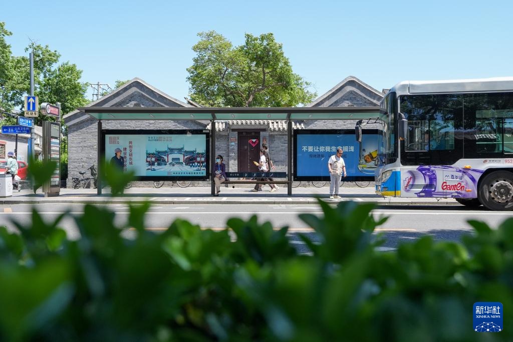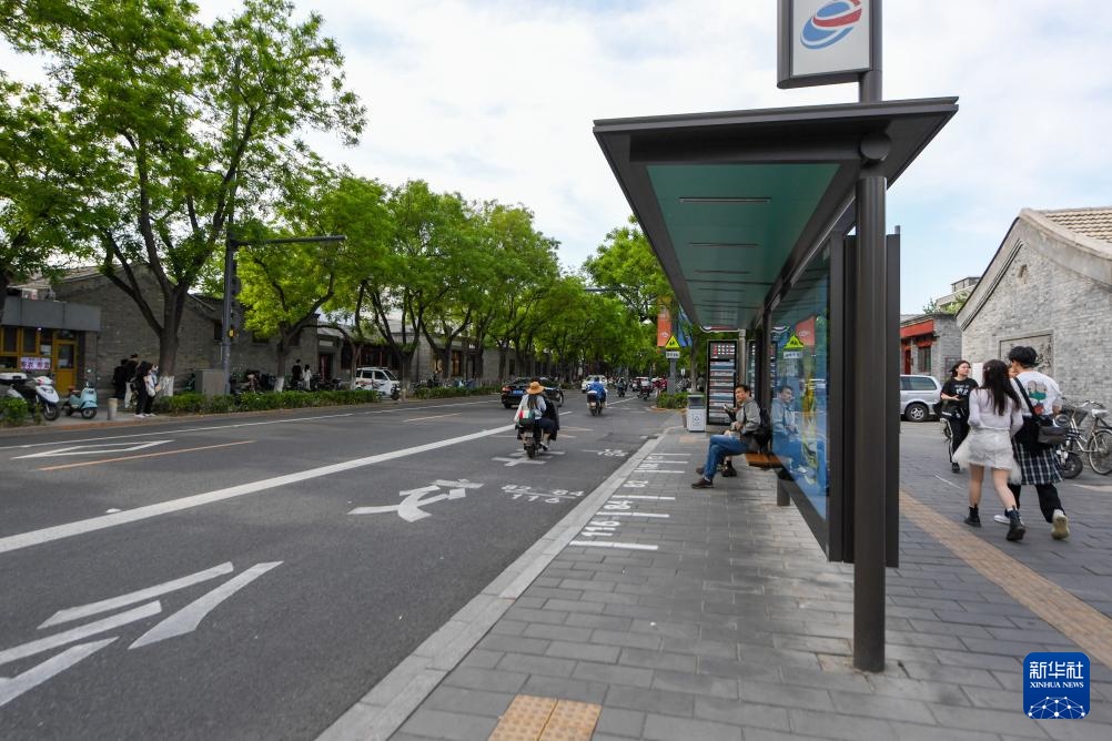 在东四北大街东四十二条公交车站,乘客在新设置的“港湾式”公交站等候公交车(5月11日摄)。