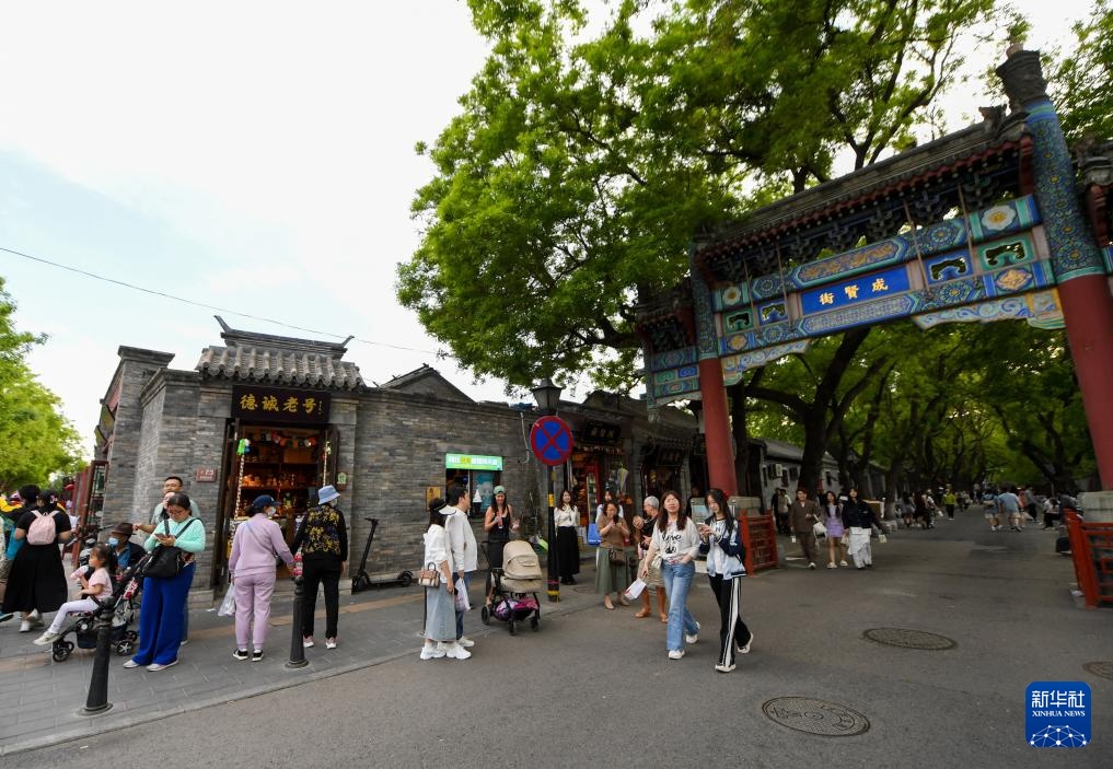 游客在雍和宫大街和成贤街路口参观游览(5月1日摄)。