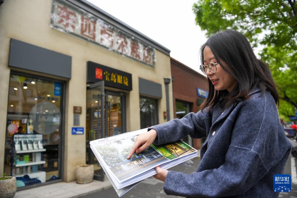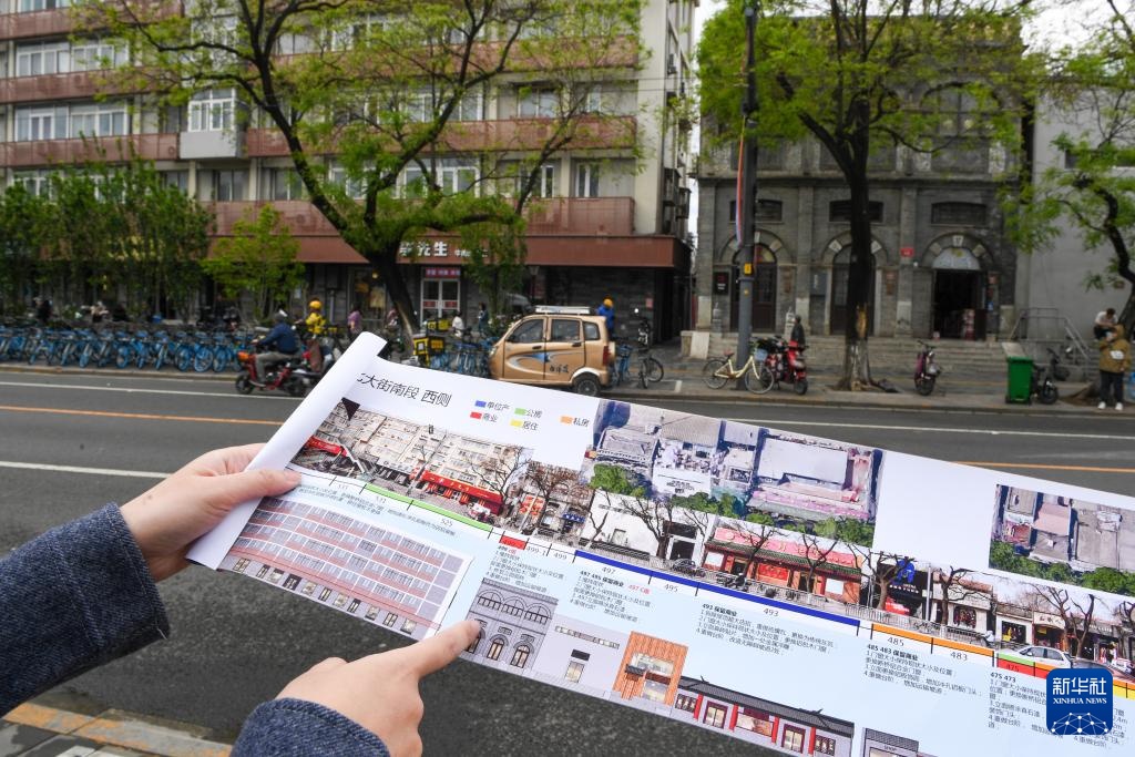 中国城市规划设计研究院高级工程师、崇雍大街整治提升工程的建筑专业负责人孙书同介绍崇雍大街改造中设置的历史文化街区探访地图(4月23日摄)。