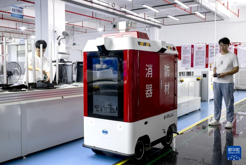 8月1日,技术人员在福建汉特云智能科技有限公司生产线上调试消防智能巡逻机器人。