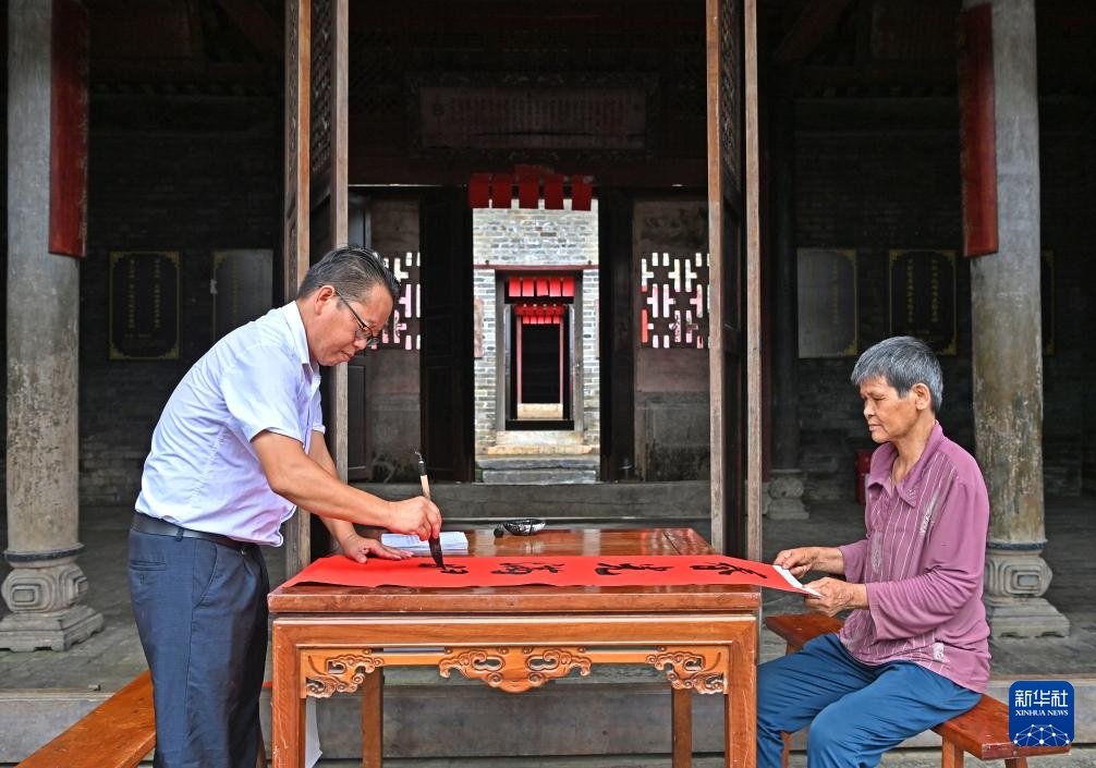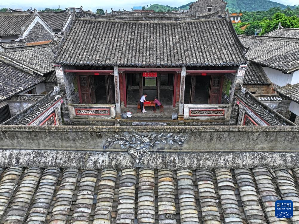 8月15日,楹联爱好者在大芦村古宅里写对联(无人机照片)。