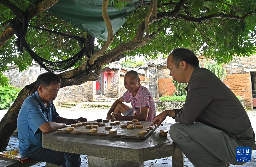 8月16日,几名村民在大芦村古宅前的树下下棋。