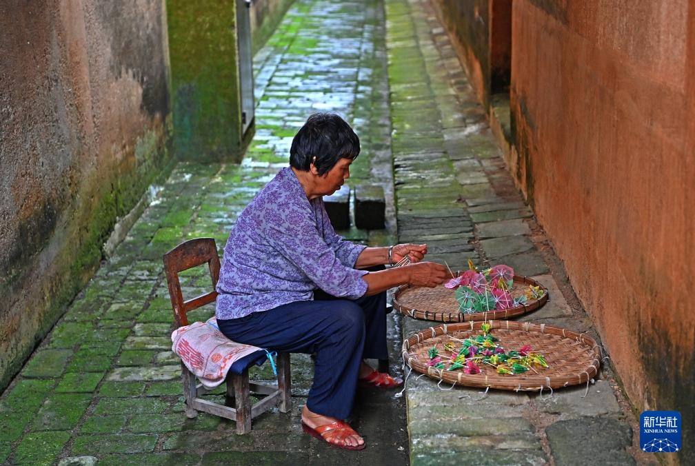 8月15日,一名村民在大芦村古宅里做手工。