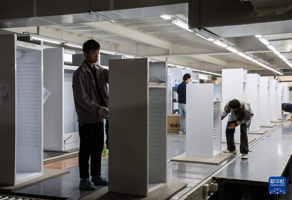 西科冷链江门制造基地的产线上,工人对一批出口日本的商用冷柜进行外观检查(3月22日摄)。