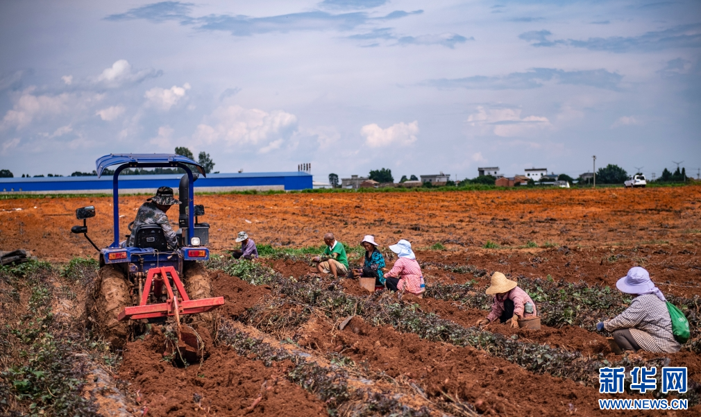 在云南省砚山县石碑寨村,村民忙着采收、分拣红薯(8月17日摄)。新华网发(熊平祥 摄)