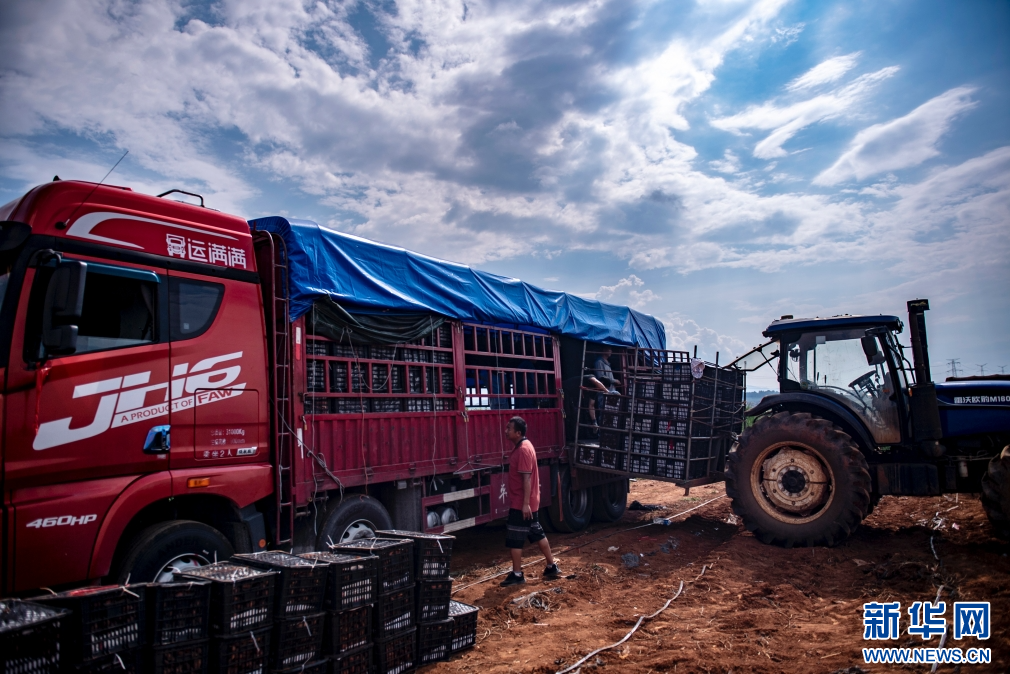 在云南省砚山县石碑寨村,村民将采收好的红薯装车(8月17日摄)。新华网发(熊平祥 摄)