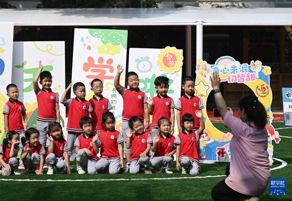 9月4日,天津市和平区第五幼儿园老师给学生们拍合影。