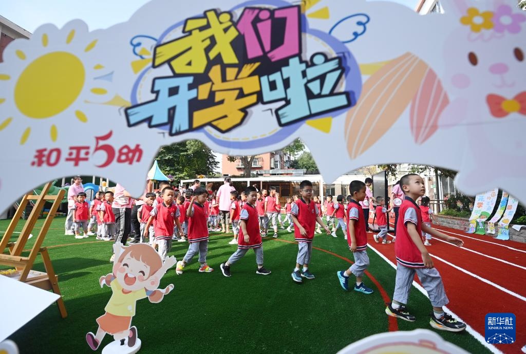 9月4日,天津市和平区第五幼儿园的孩子们在开学典礼上。