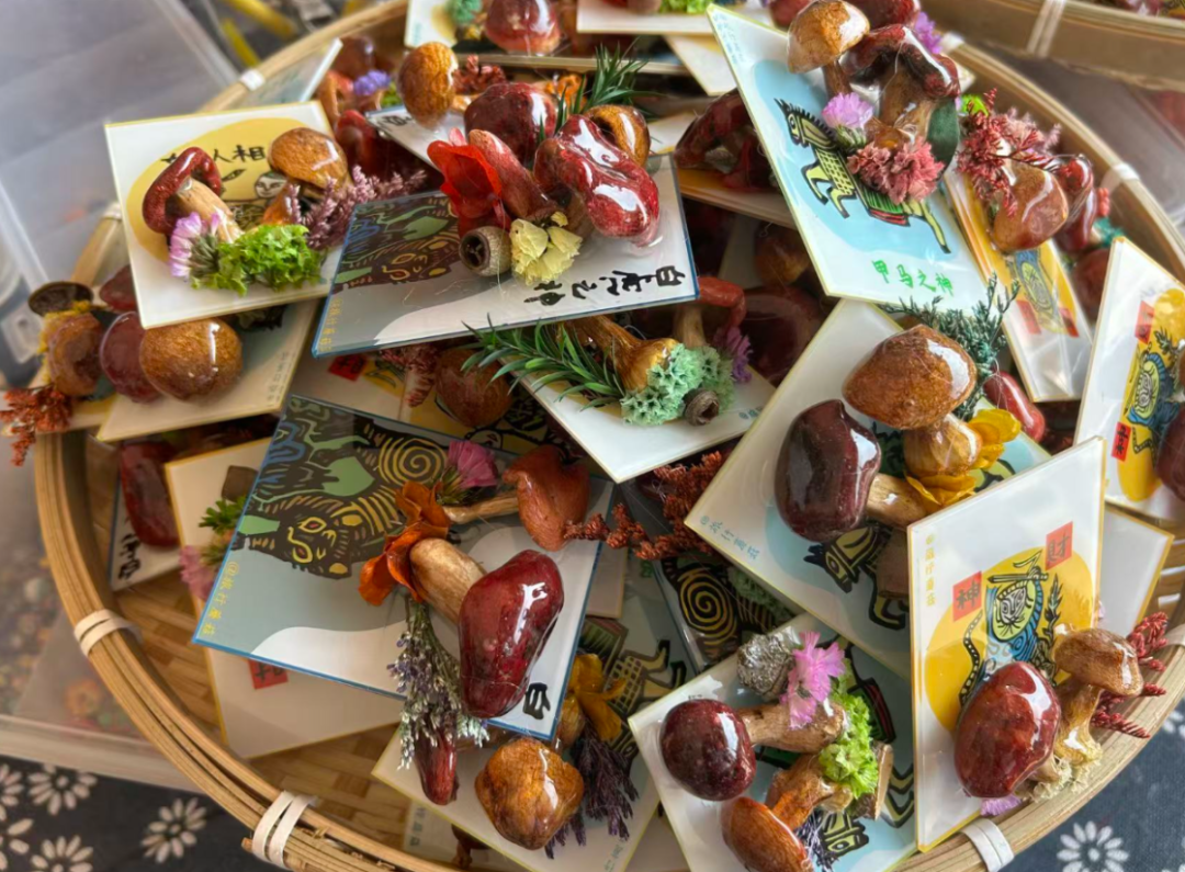 3年前,迁居昆明的董芊汝是个全职妈妈。“起初只想摆地摊赚点零花钱,把老家带来的菌子做成标本饰品,没想到一发不可收拾。”她笑着回忆,一次在社交平台分享手作过程,意外收获上千点赞,有人特意留言:“能不能定做带民族纹样的”,这让她突然意识到云南的菌子和非遗技艺能碰撞出火花。