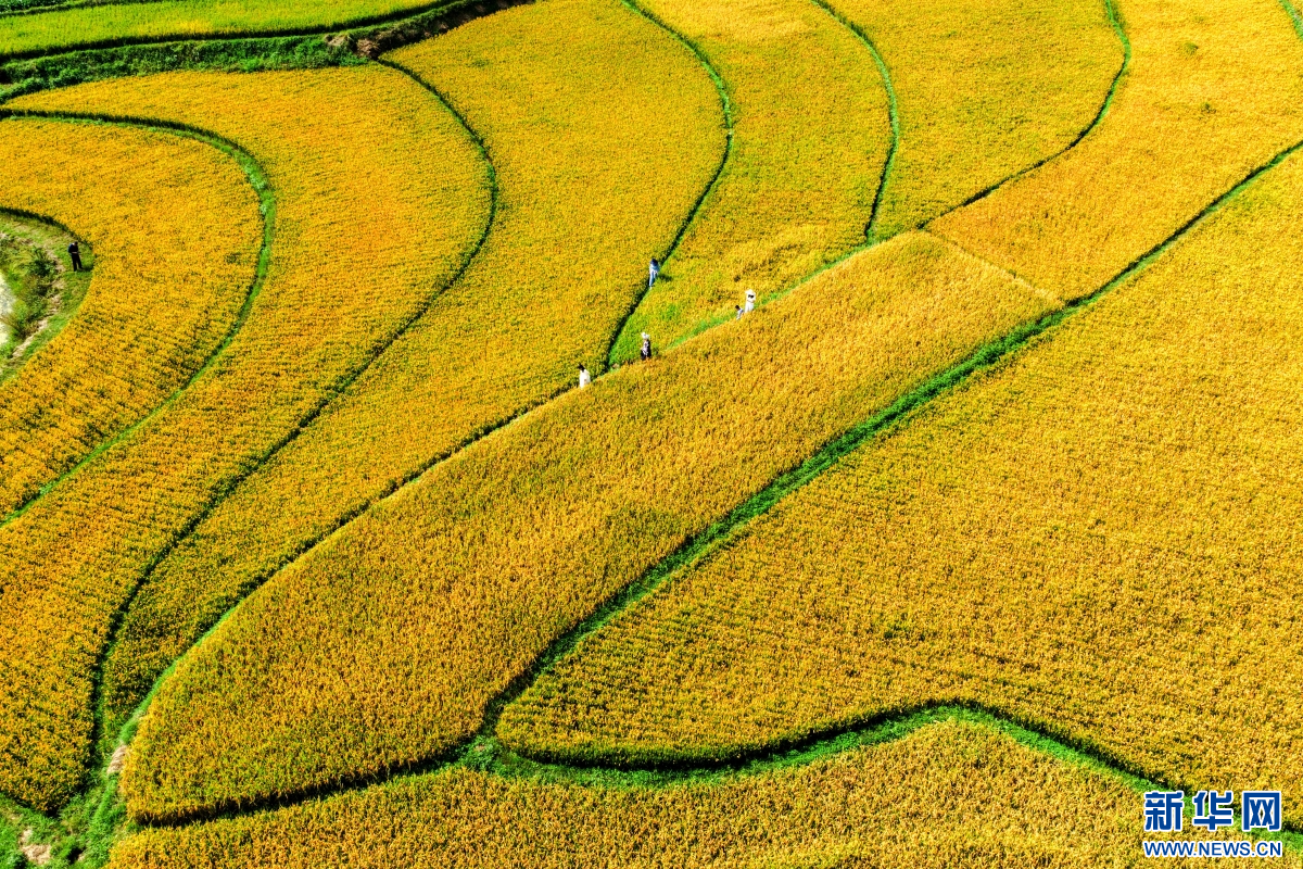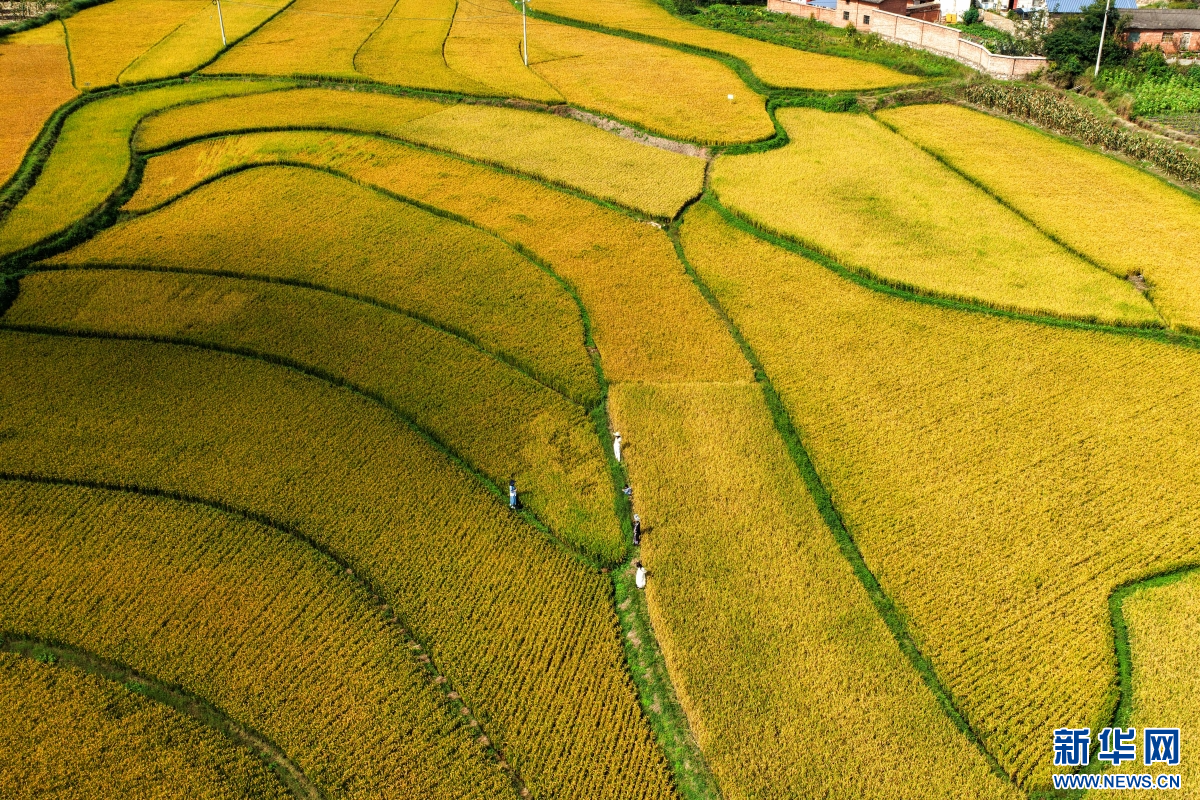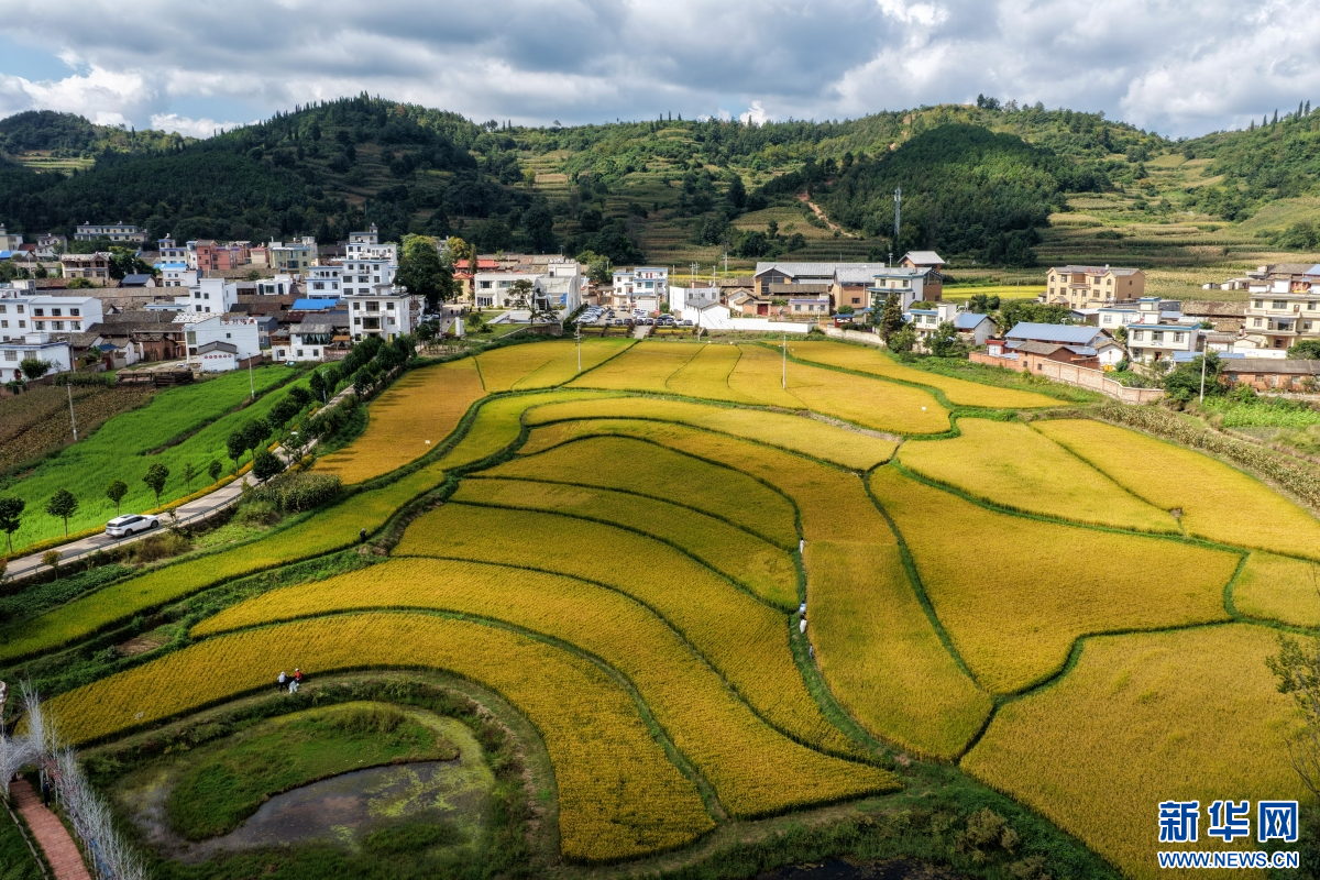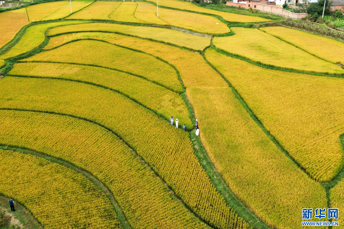 秋日里,云南省曲靖市沾益区龙华街道红瓦房村,稻浪层层翻滚,在阳光照耀下泛起金光。空中俯瞰,田埂纵横交错,勾勒出优美的线条,吸引游客前来游玩欣赏,放松休闲。(孙文来)