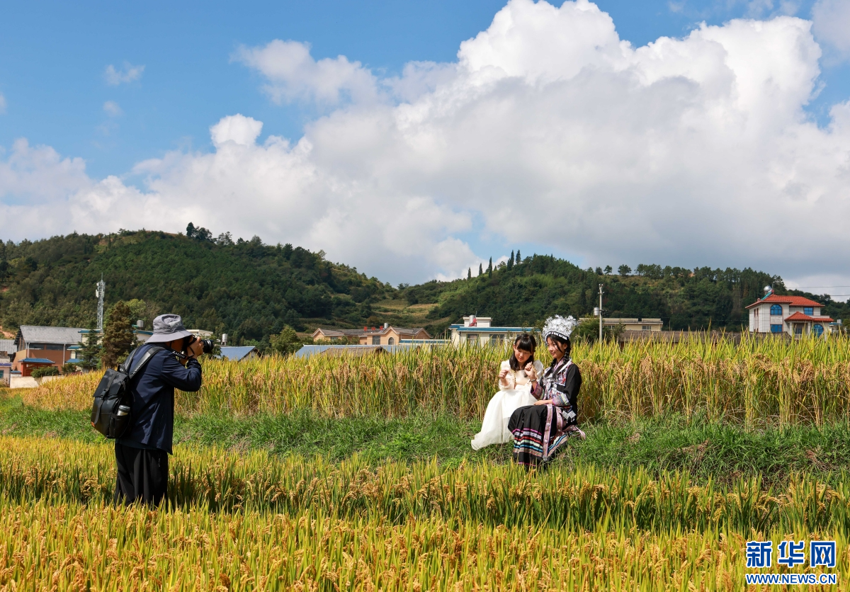 游客在稻田中游玩拍照(10月5日摄)。新华网发(孙文来 摄)