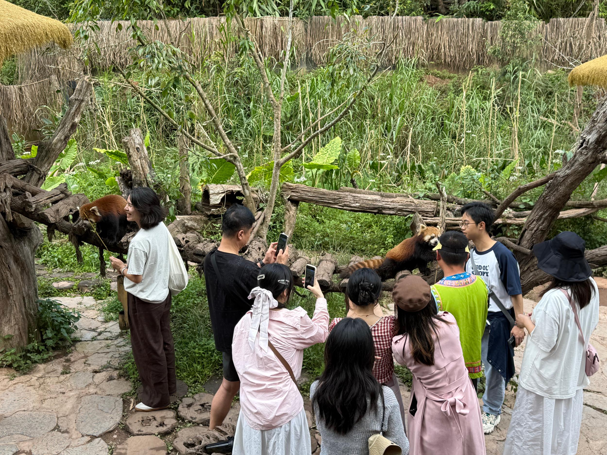 往里走,动物园区里聚集了不少游客。极具个性的白犀牛们悠闲地躺在地上,尾巴时不时扫动一下,偶尔抬起眼皮看看人群,以此来回应游客对它的喜爱;小熊猫互动区前围满了家长和孩子,大家有序排队跟小熊猫合照、投喂零食、看着毛茸茸的小家伙们抱着食物啃得津津有味,现场笑声不断。除此之外,景区还有小浣熊、长臂猿、赤麂、卡皮巴拉(水豚)等多种动物种群,都深受游客喜爱。来自四川的游客曾永梅看完小熊猫之后开心地分享:“太阳河森林公园特别好玩,最让我深有感触的一点是这里有很多小动物,而且它们特别自由,这里的猴子、小熊猫都可以漫山遍野跑,我可以和它们近距离地交流,还可以投喂它,我觉得这一点是非常人性化的。”